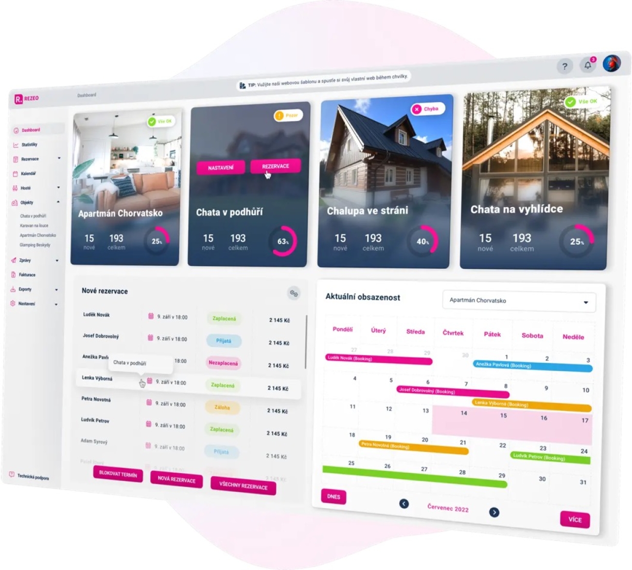 V září 2025 jsme spustili novou generaci rezervačního systému REZEO 2.0, která přináší modernější prostředí a vylepšené nástroje pro správu rezervací ubytování. Systém pomáhá pronajímatelům mít přehled o rezervacích, platbách i komunikaci s hosty na jednom místě. Na vývoji ale dál pracujeme – REZEO 2.0 budeme postupně rozšiřovat o nové funkce, takže se naši uživatelé mají na co těšit. ✨