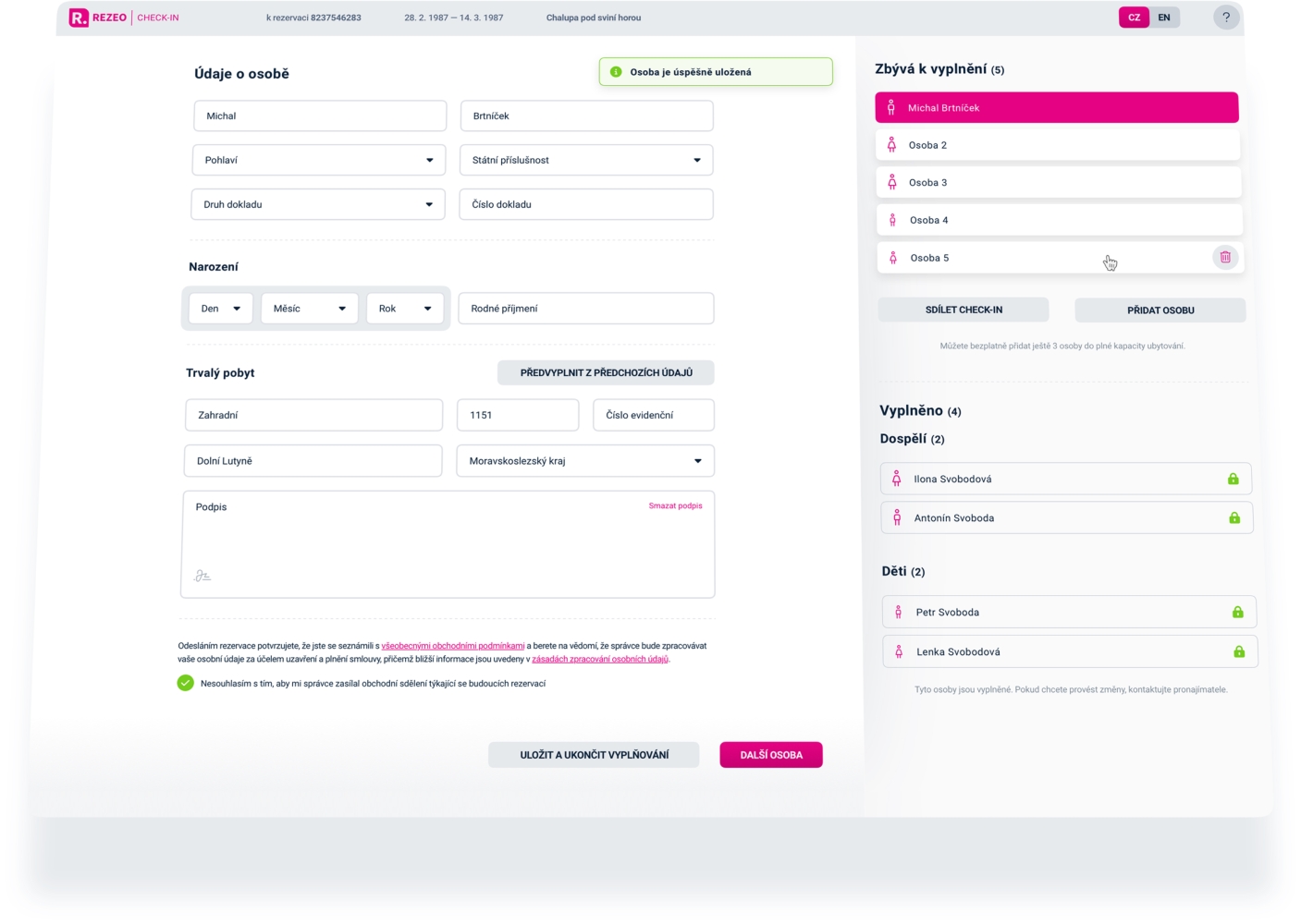 V systému REZEO jsme spustili nový modul Elektronická kniha hostů, který vám pomůže jednoduše splnit zákonné povinnosti a zároveň zjednodušit administrativu spojenou s ubytováním hostů. Modul obsahuje praktickou funkci Online check-in, díky které mohou hosté vyplnit potřebné údaje ještě před příjezdem.